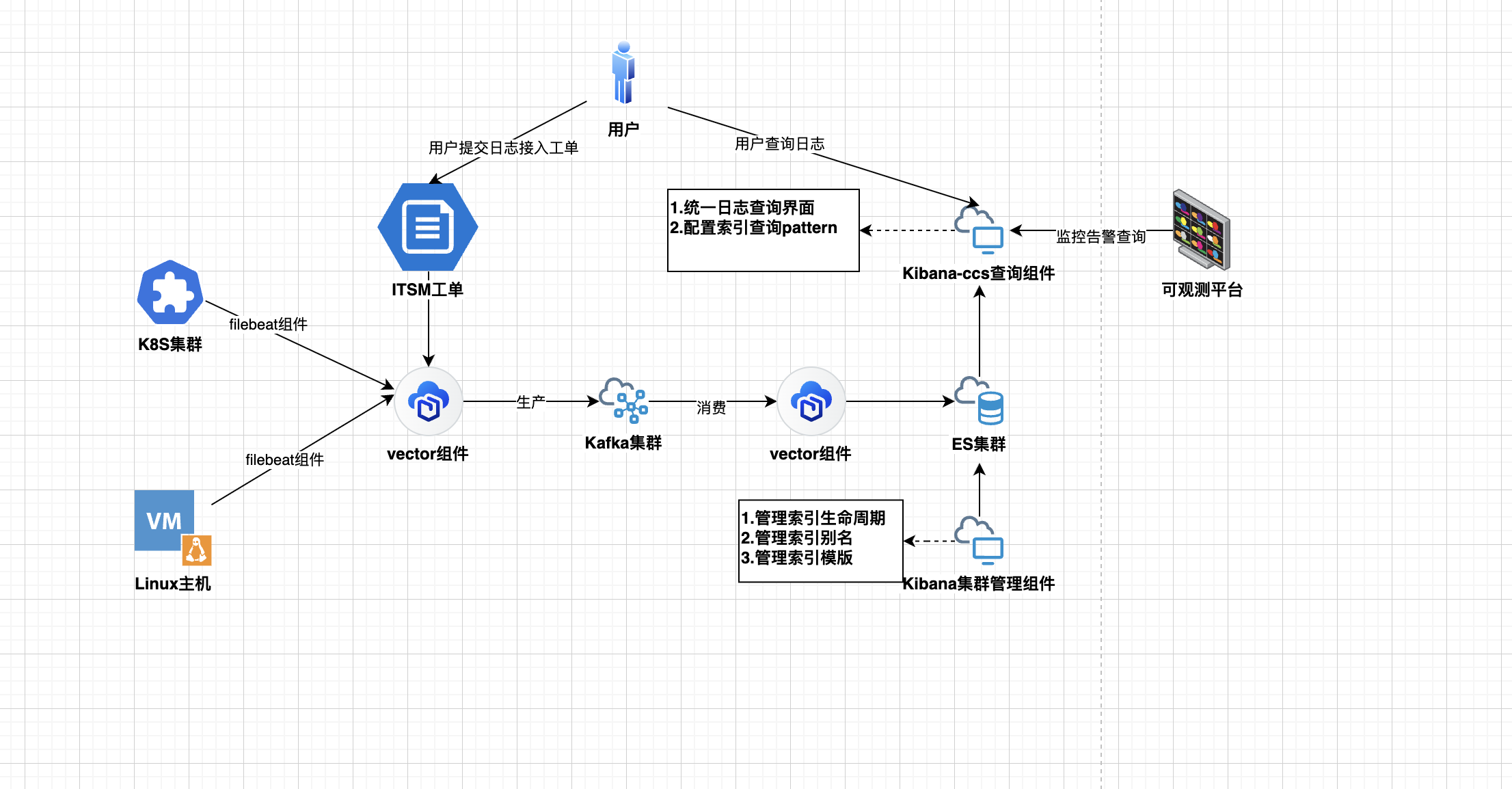日志接入从应用到 ES 需要经过多个组件,涉及到业务应用跟 topic 映射配置,topic 跟日志索引映射配置,针对不同的应用日志需要设置单独的索引生命周期,分片数,索引模版以及查询模版。整个日志接入流程下来,需要大概花费耗时 2 小时。原来整体日志接入流程如下: