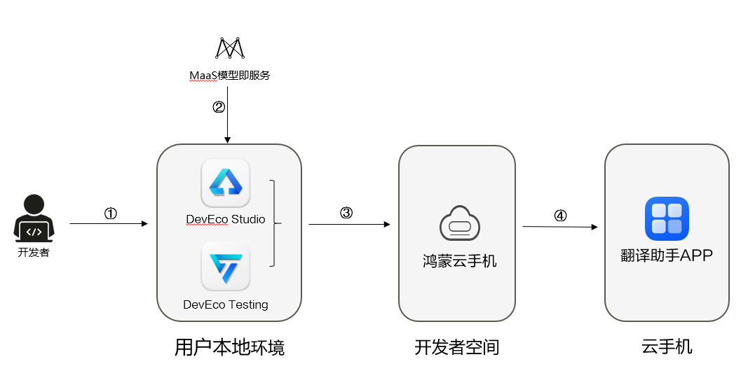 本案例通过鸿蒙应用开发工具 DevEco Studio、测试工具 DevEco Testing 远程连接鸿蒙云手机,集成华为云 MaaS,开发调试鸿蒙原生应用-翻译助手 APP。