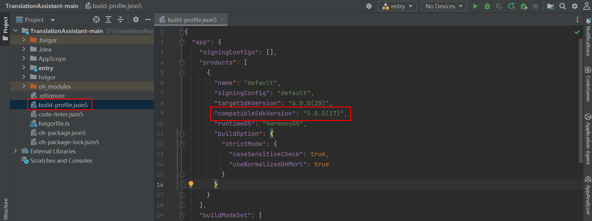 修改项目级目录下 build-profile.json5 文件中 sdk 编译版本。因为鸿蒙云手机是鸿蒙 5.0,所以需要修改代码编译 sdk 版本,compatibleSdkVersion 修改为:5.0.5(17)