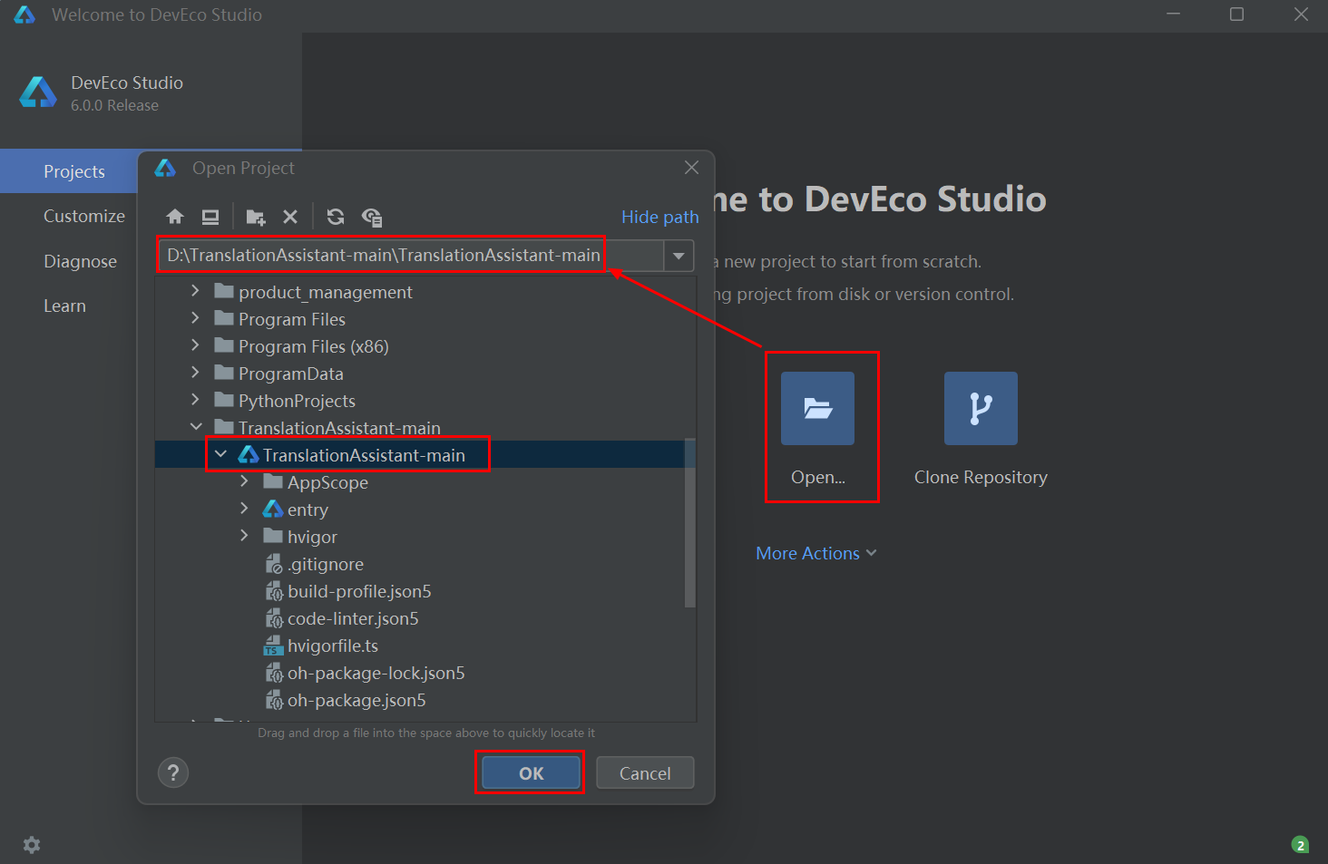 源码下载:TranslationAssistant,下载解压完成后,使用 DevEco Studio 打开项目源码: