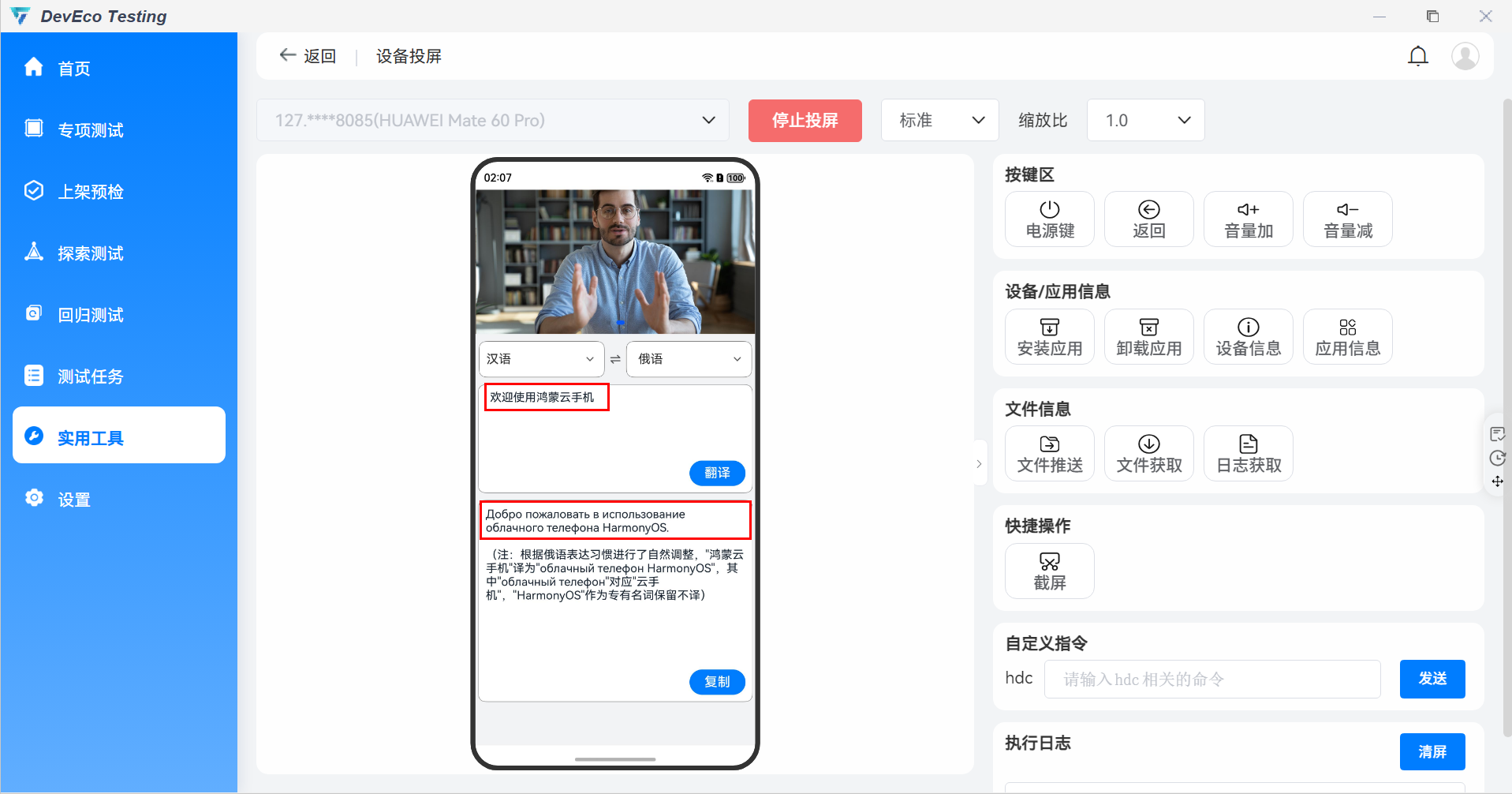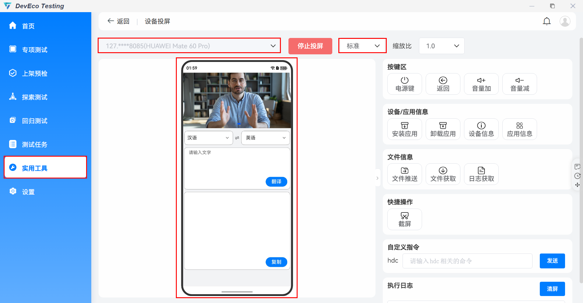 打开 DevEco Testing,选择【标准】模式,翻译助手 APP 代码已经运行在鸿蒙云手机上了。