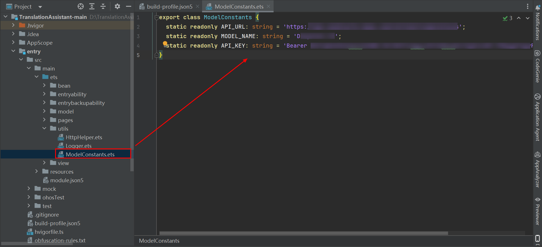 注意:替换 ModelConstants.ets 文件中的常量 MODEL_NAME、API_URL、API_KEY。