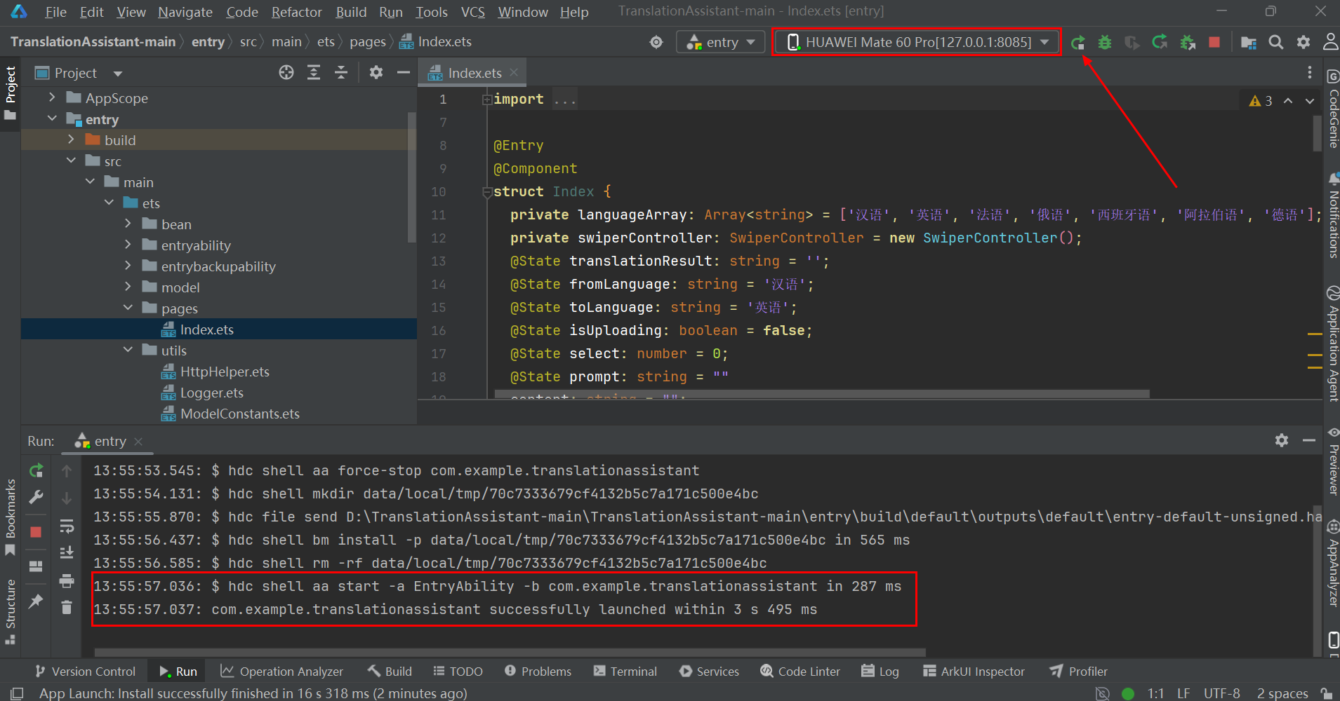 使用鸿蒙云手机调试运行翻译助手 APP 代码。