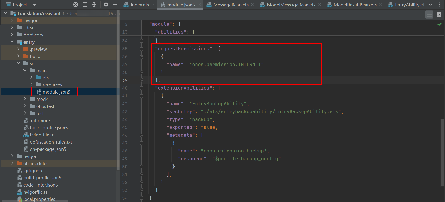 在 entry->src->main->module.json5 文件中声明网络权限: