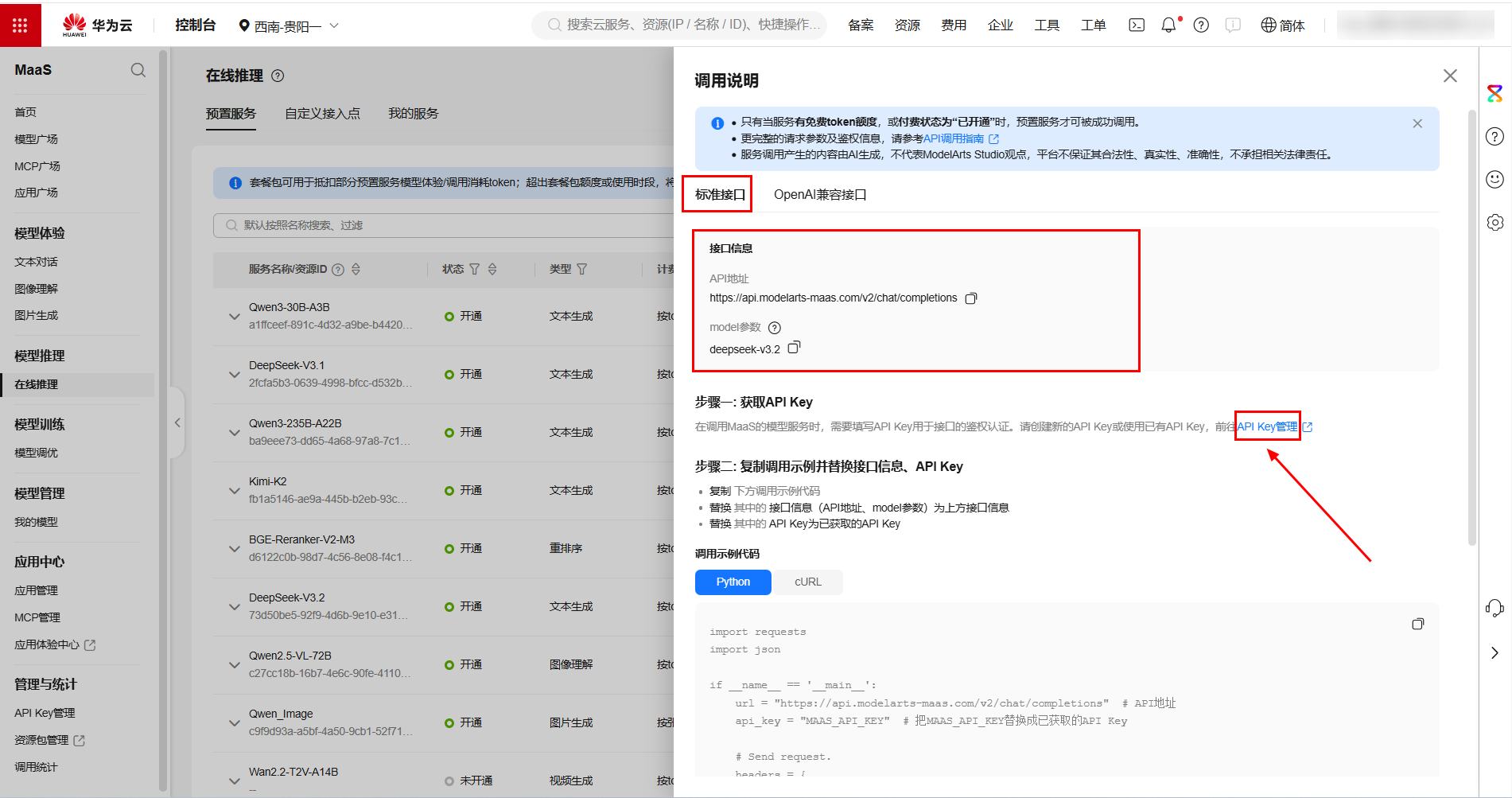 方式二: 登录华为开发者空间,参考案例《华为云MaaS平台大模型Tokens领取使用指导》中的“二、 领取 MaaS 平台大模型 Tokens”章节内容,领取 MaaS 平台 DeepSeek V3 系列大模型 Tokens 代金券,购买 ModelArts Studio DeepSeek Tokens 套餐包,开通模型服务,最后获取到模型的 API 地址、模型名称和 API Key。