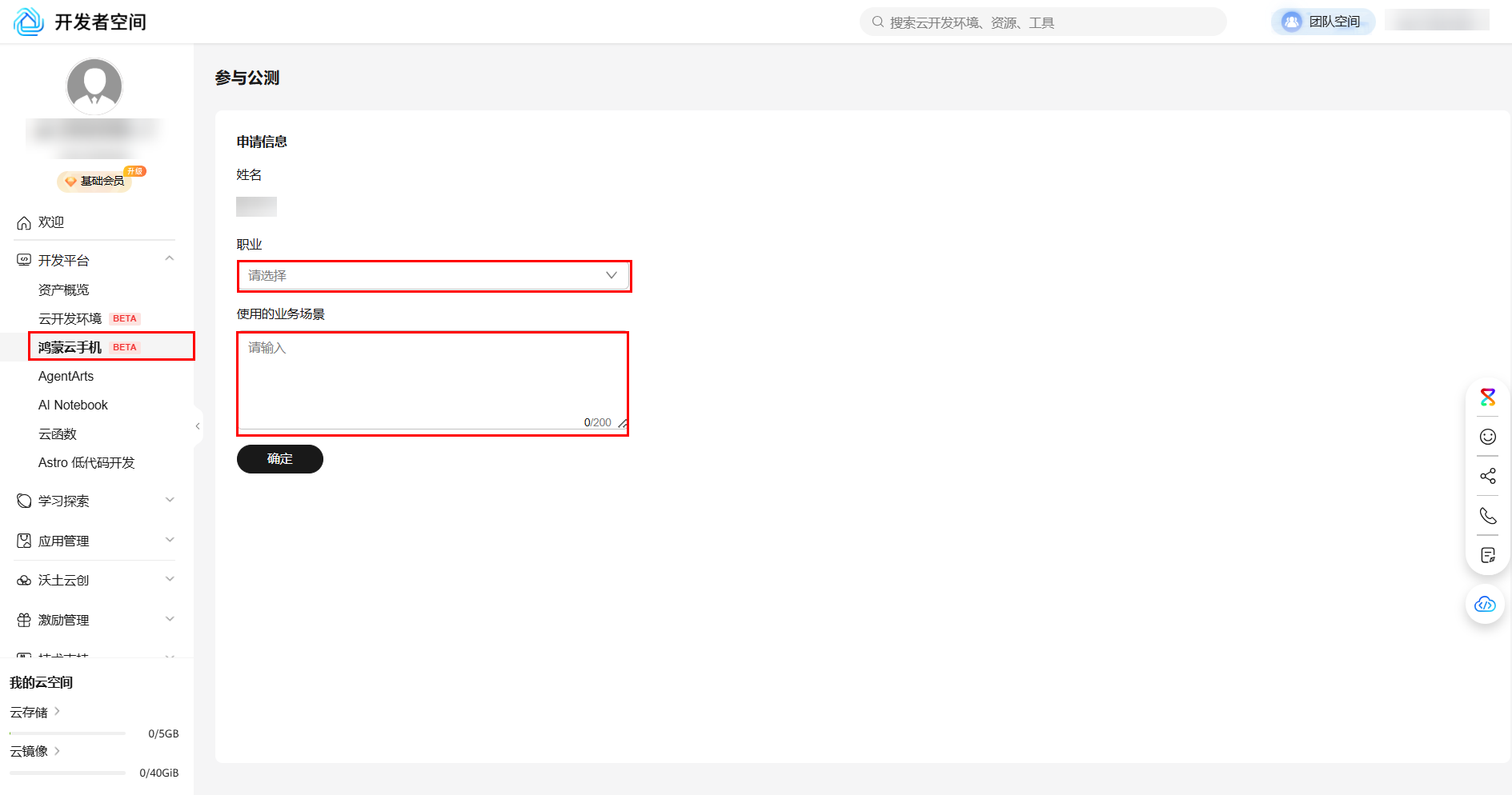 登录华为开发者空间,点击鸿蒙云手机,选择职业,输入使用的业务场景,参与公测。