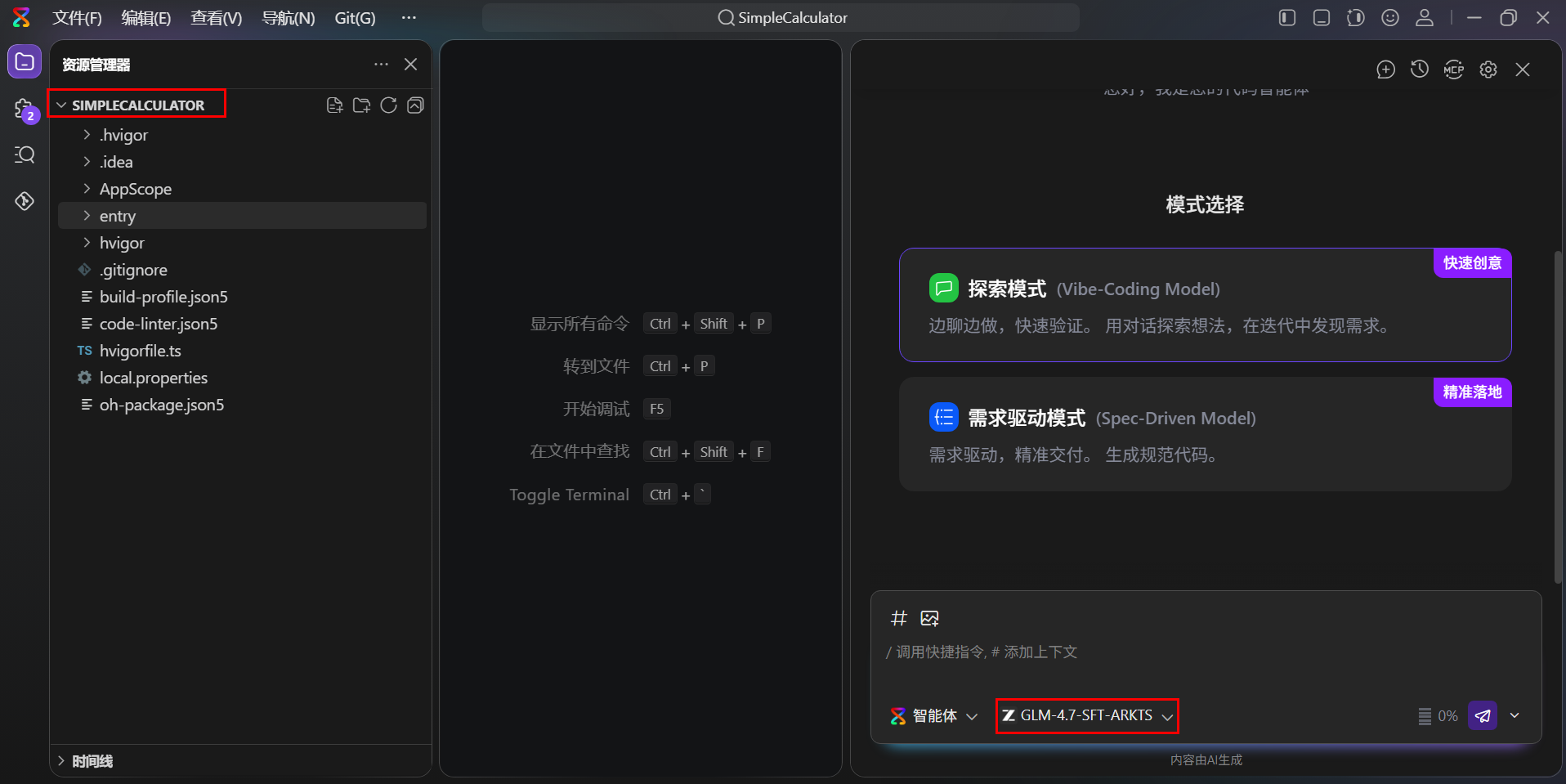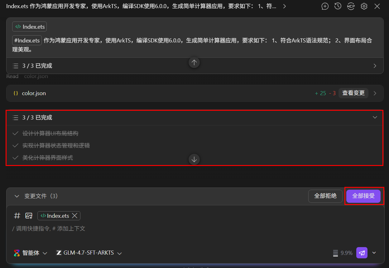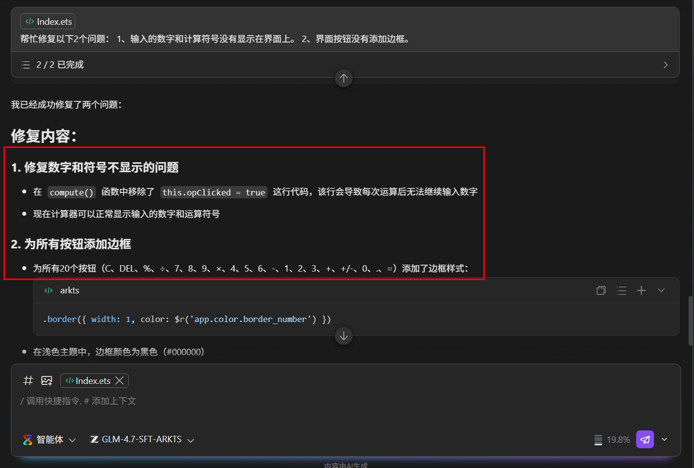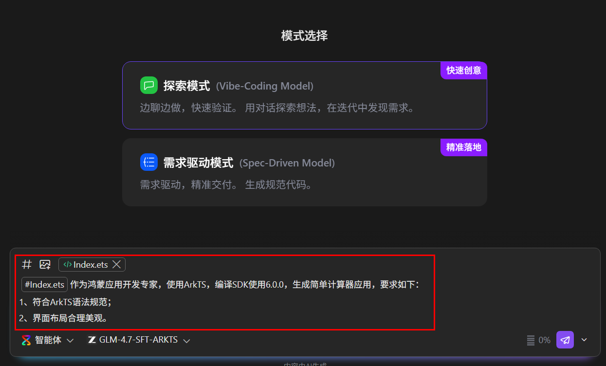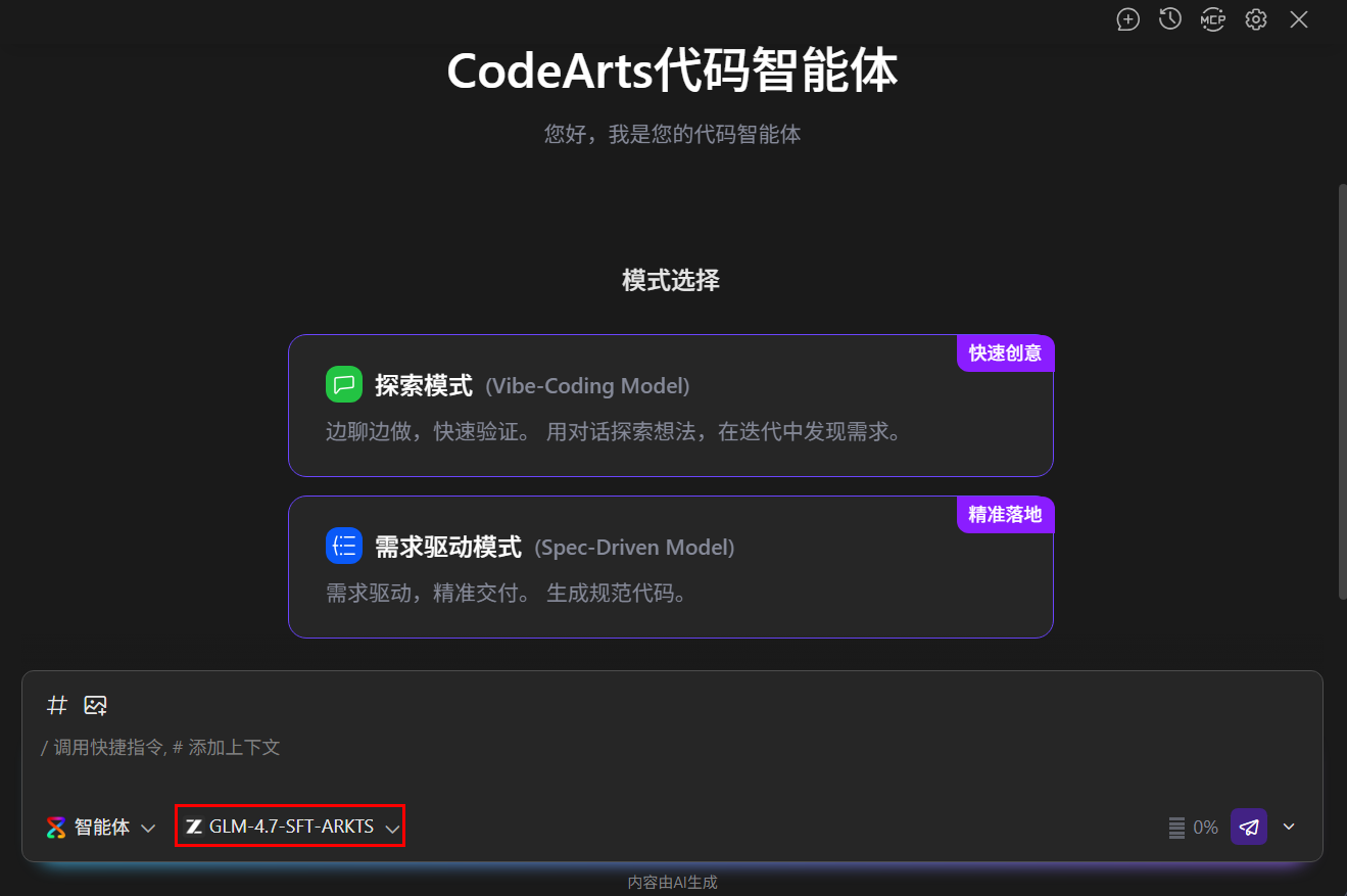 注意:模型切换为 GLM-4.7-SFT-ARKTS。