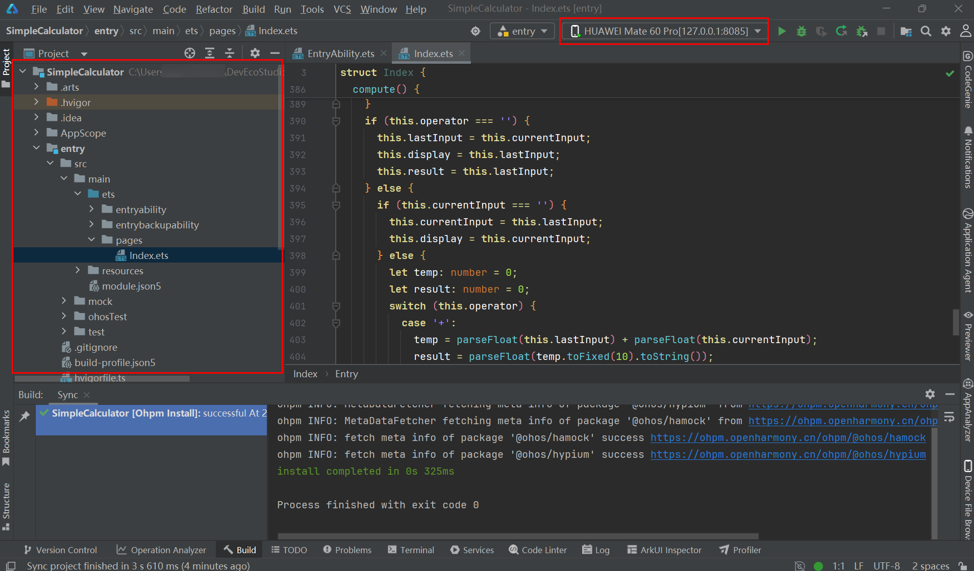 使用鸿蒙云手机调试运行鸿蒙简单计算器应用代码。