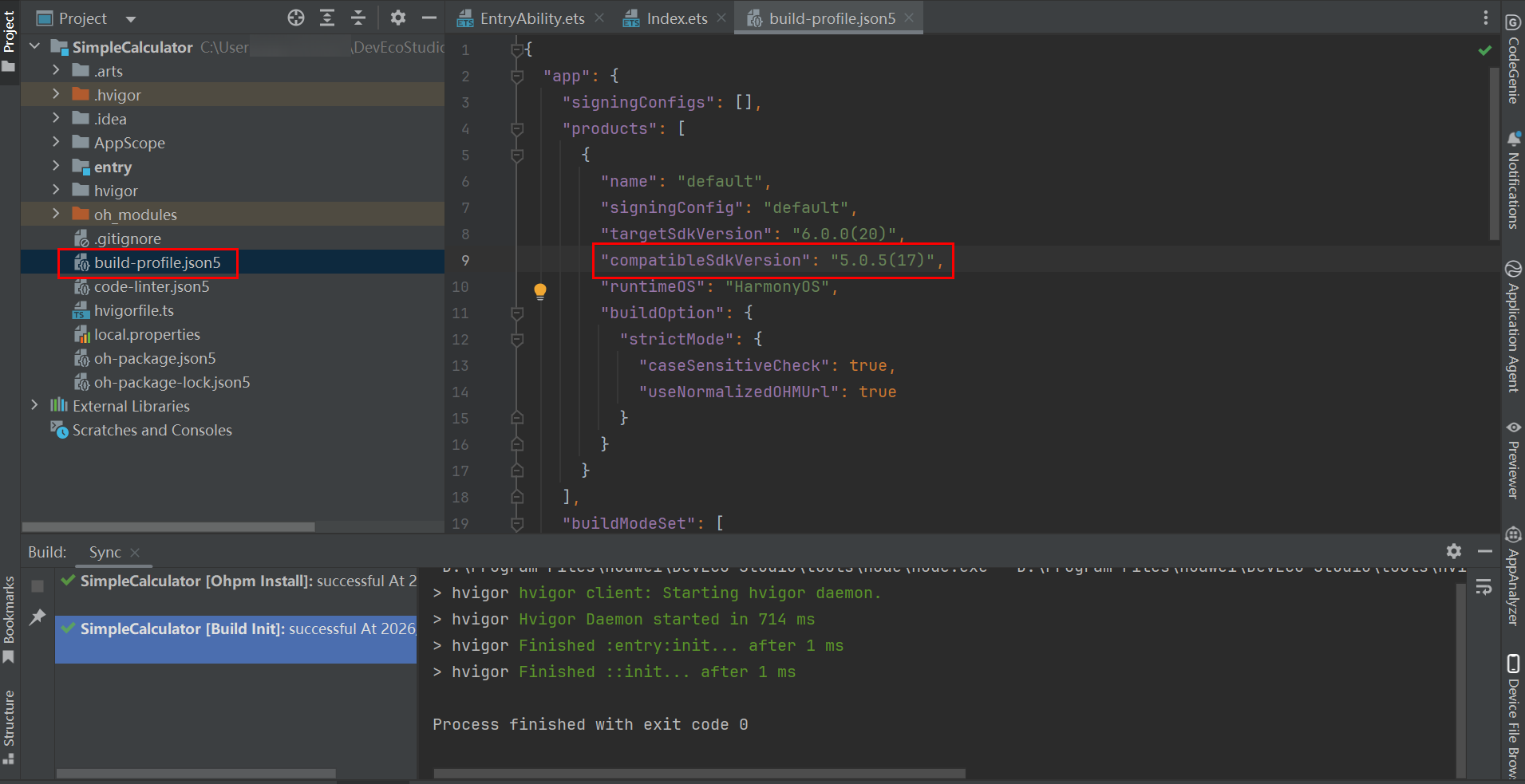 修改项目级目录下 build-profile.json5 文件中 sdk 编译版本。因为鸿蒙云手机是鸿蒙 5.0,所以需要修改代码编译 sdk 版本,compatibleSdkVersion 修改为:5.0.5(17),修改完成后同步项目。