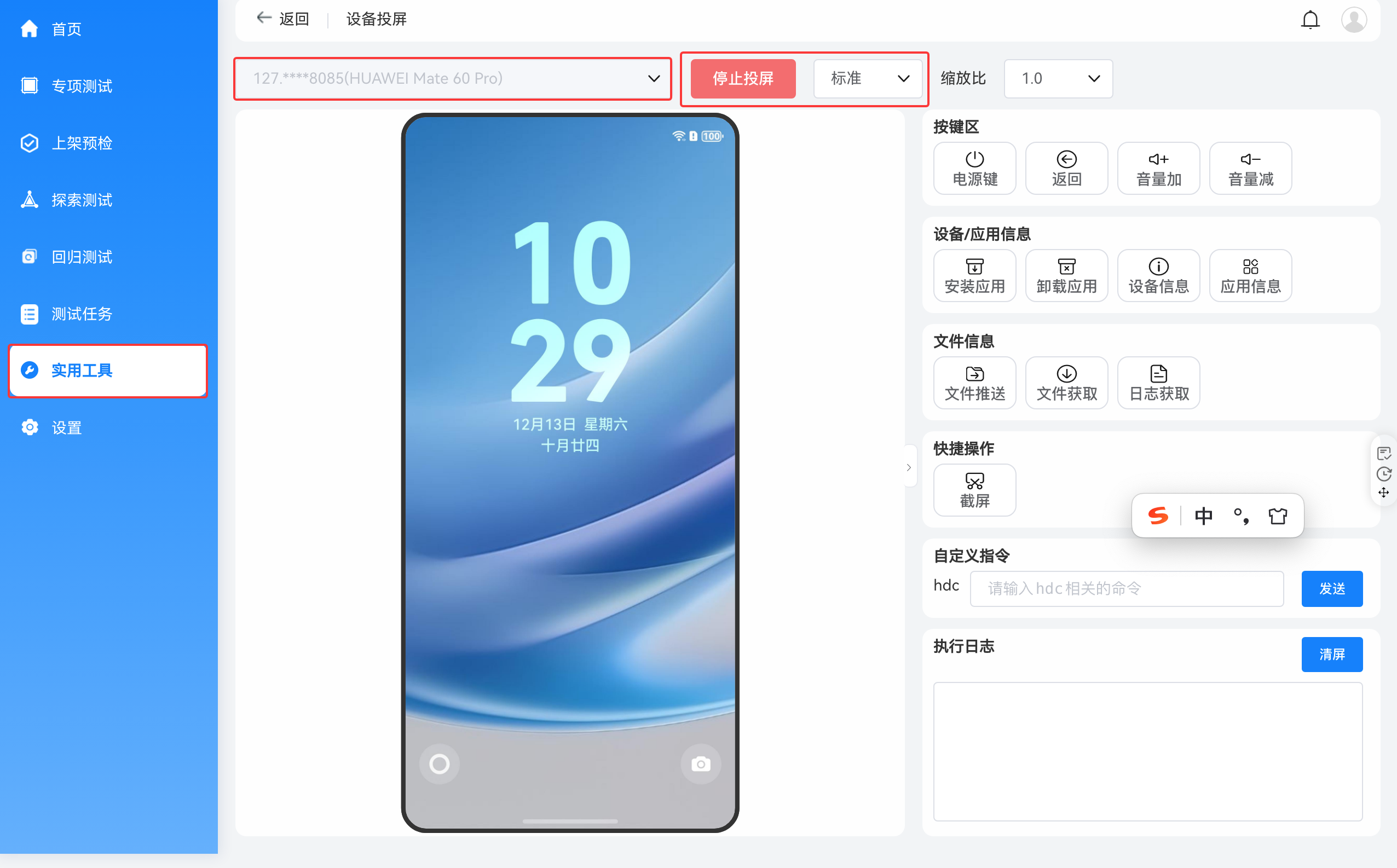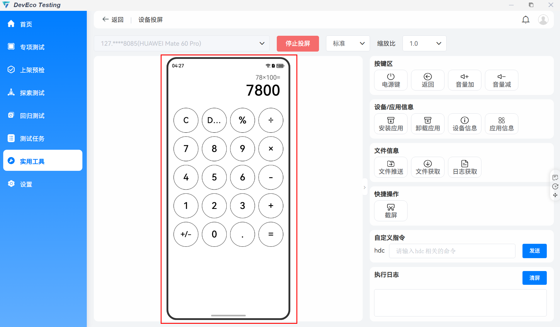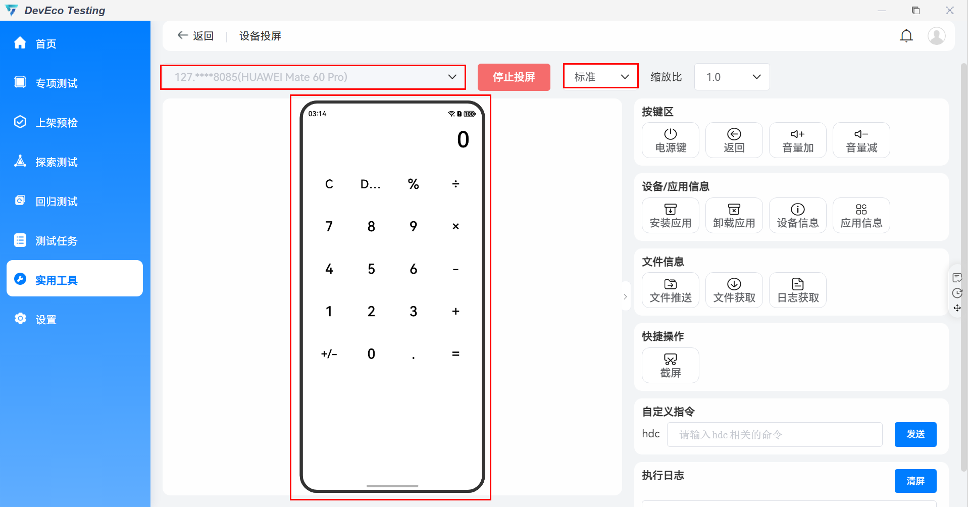打开 DevEco Testing,选择【标准】模式,简单计算器代码已经运行在鸿蒙云手机上了。