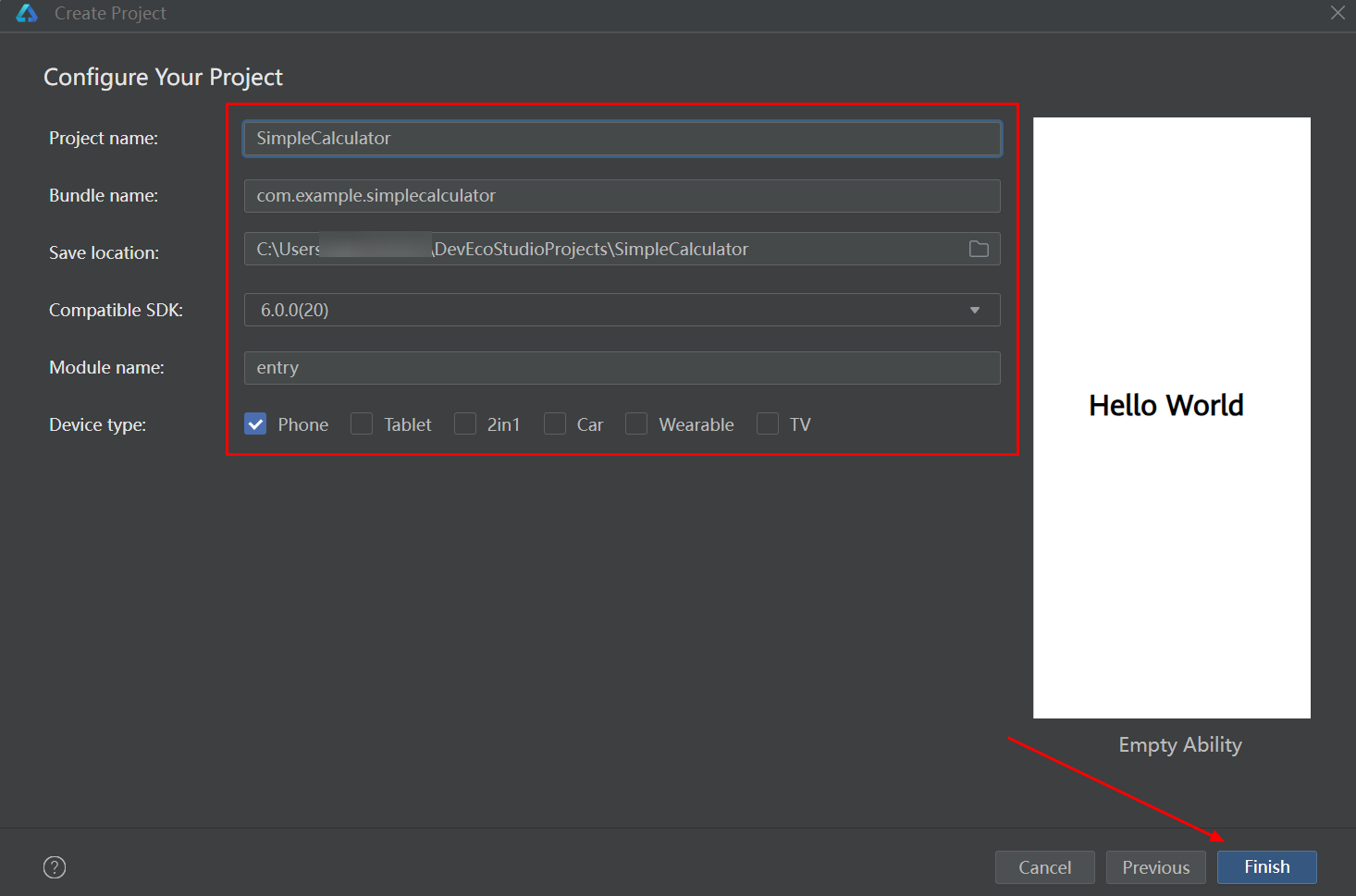 进入配置工程界面,项目名称 SimpleCalculator,Compatible SDK 表示兼容的最低 API Version,此处以选择 6.0.0(20)为例,其他参数保持默认设置即可。