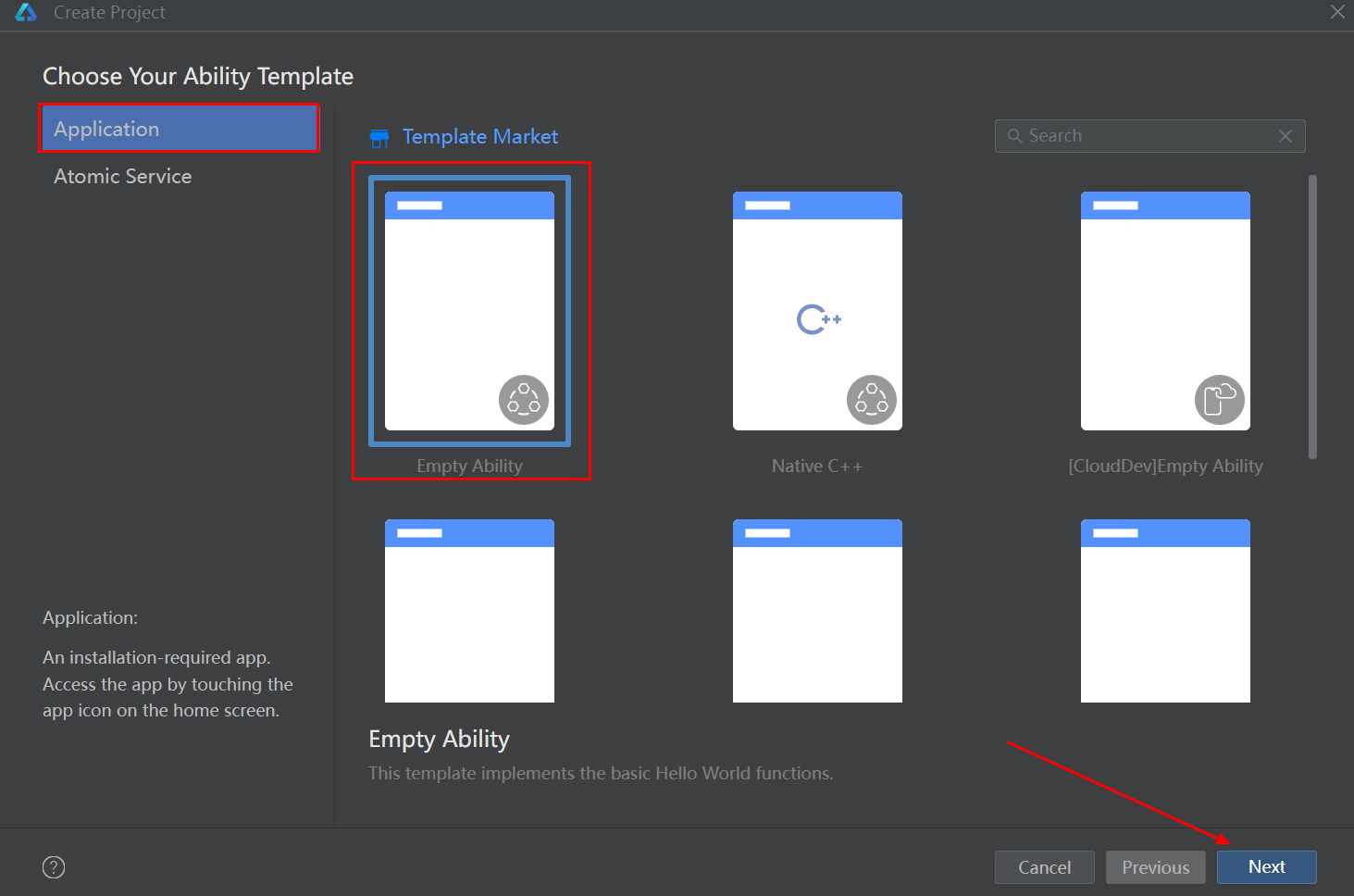 点击 Application,选择 Empty Ability 模板,单击 Next 进行下一步配置。