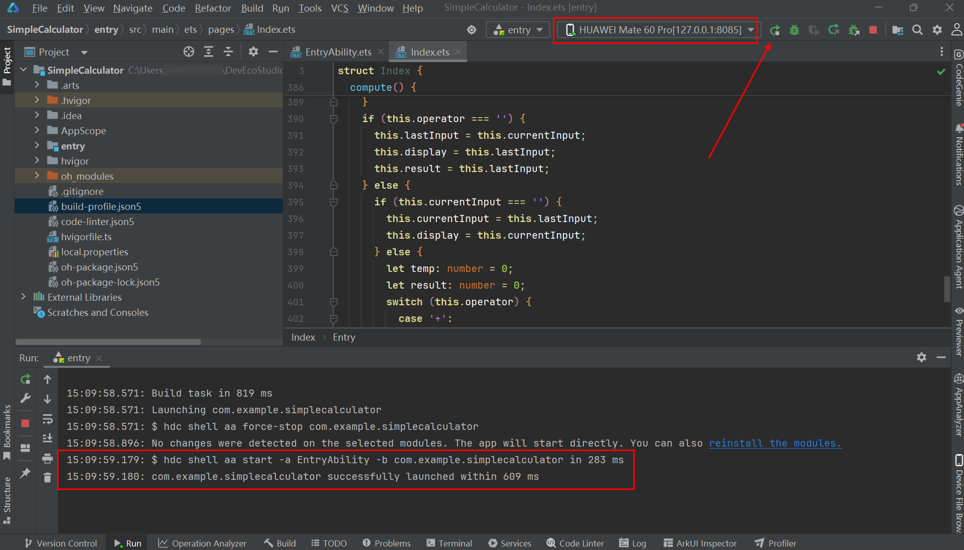 DevEco Studio 编译器连接云手机后,点击右上角运行按钮,运行项目代码: