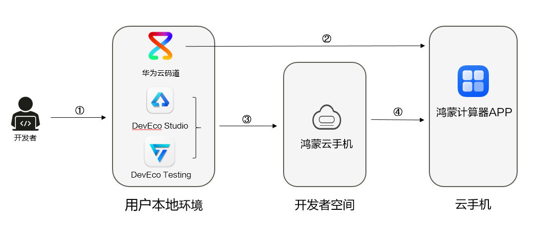本案例使用鸿蒙应用开发工具 DevEco Studio 创建项目,基于华为云码道自动生成简单计算器应用代码,通过鸿蒙应用开发工具 DevEco Studio、测试工具 DevEco Testing 远程连接鸿蒙云手机,开发调试鸿蒙计算器应用。