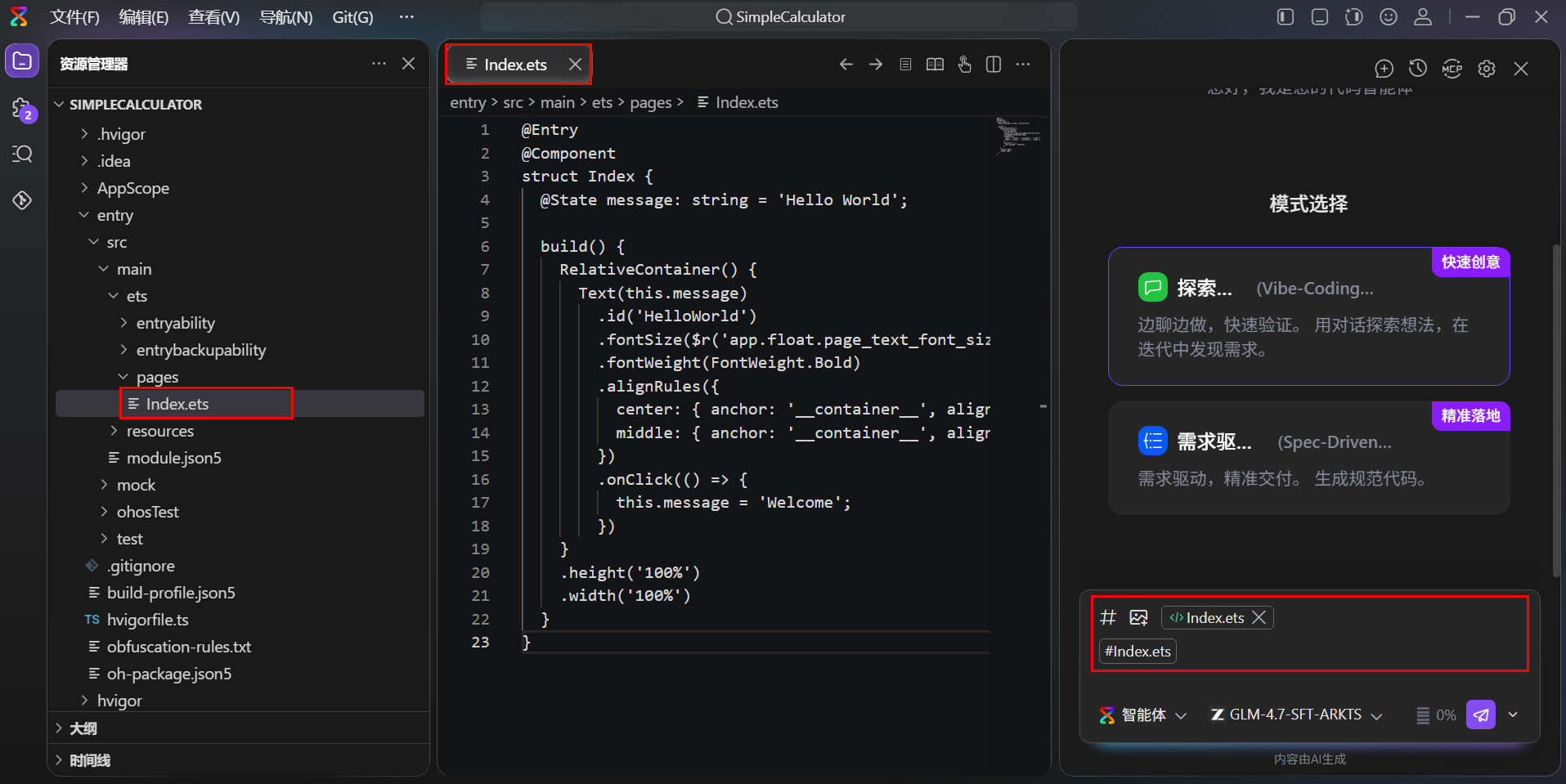 打开 Index.ets 文件,对话框中输入“#”号,点击 File,选择 Index.ets 文件。