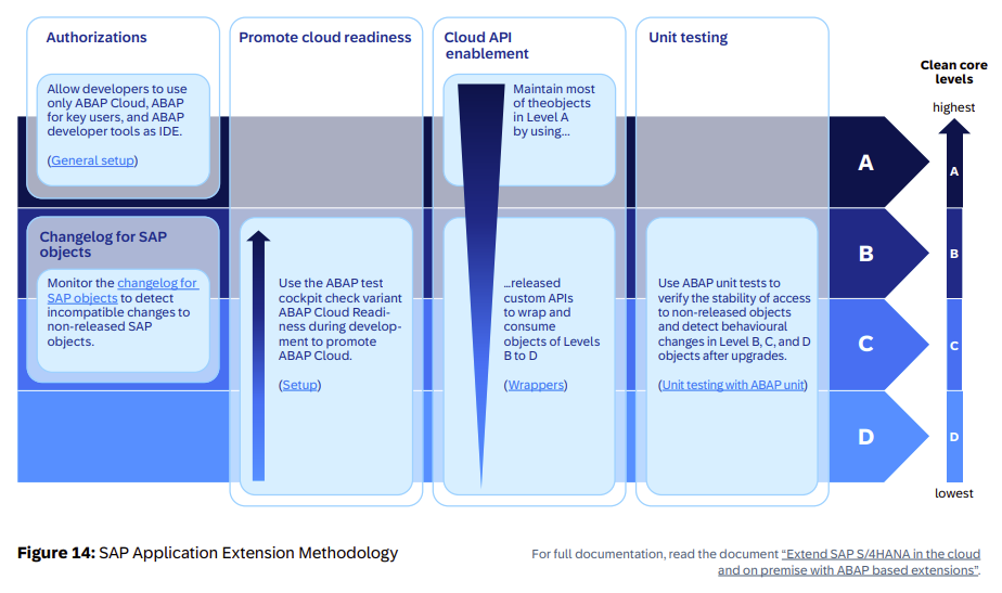 有了这些信息,应该使用自顶向下的方法规划开发,从 Clean Core 等级 A 到 Clean Core 等级 D,从紧密耦合过渡到松散或完全解耦的扩展。