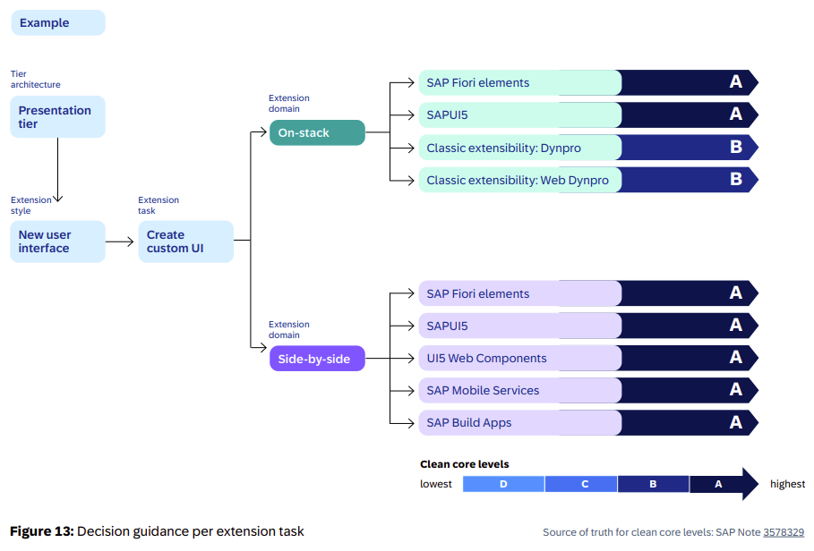 要识别合适的扩展技术或框架,请参考 SAP 注释 3578329,它将遗留技术分类为 Clean Core 等级并提供推荐使用的清晰指导。