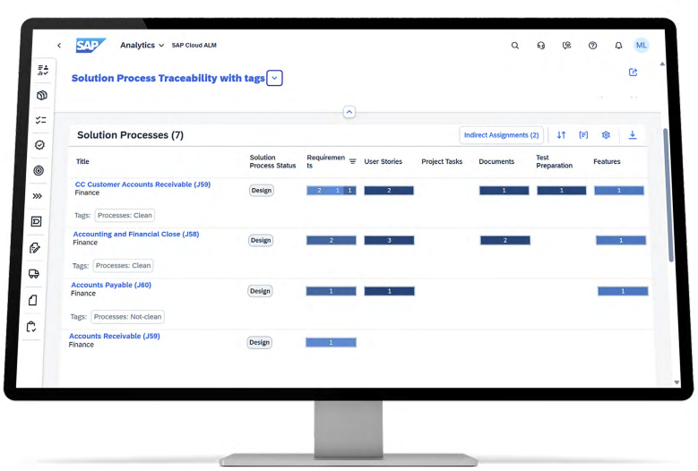 这些标签可以应用在 SAP Cloud ALM 的解决方案流程可追溯性报告上。它们允许评估计划或实施的解决方案流程以及分配的需求、用户故事和功能是否被分类为"清洁"或"不清洁"。从此视图,用户还可以导航到相关的可追溯性和概述页面(例如需求可追溯性)以检查更多详细信息。