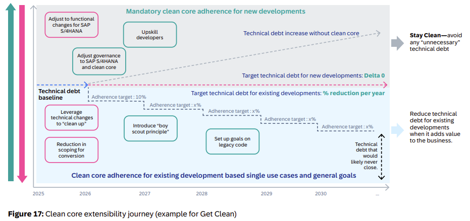 无论从哪里开始,Clean Core 都是一种可以——且需要——根据特定需求定制的方法。一些组织可能已经接近其理想状态,而其他组织需要管理通过多年或数十年自定义开发积累的技术债务。无论您的出发点如何,两个关键目标是普遍有效的: