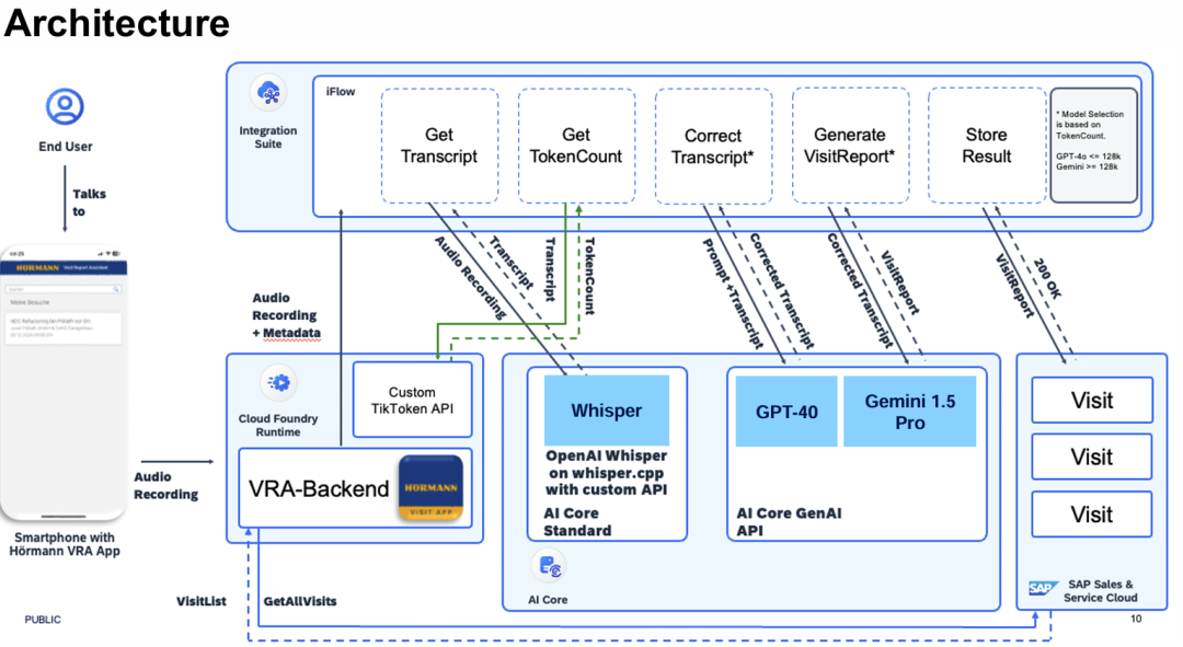 AI 驱动的语音转文本 基于 SAP BTP 自主开发拜访报告助手,集成 SAP Sales Cloud。销售代表通过移动应用对已创建的拜访记录进行语音输入,系统使用 OpenAI Whisper 进行音频转录。